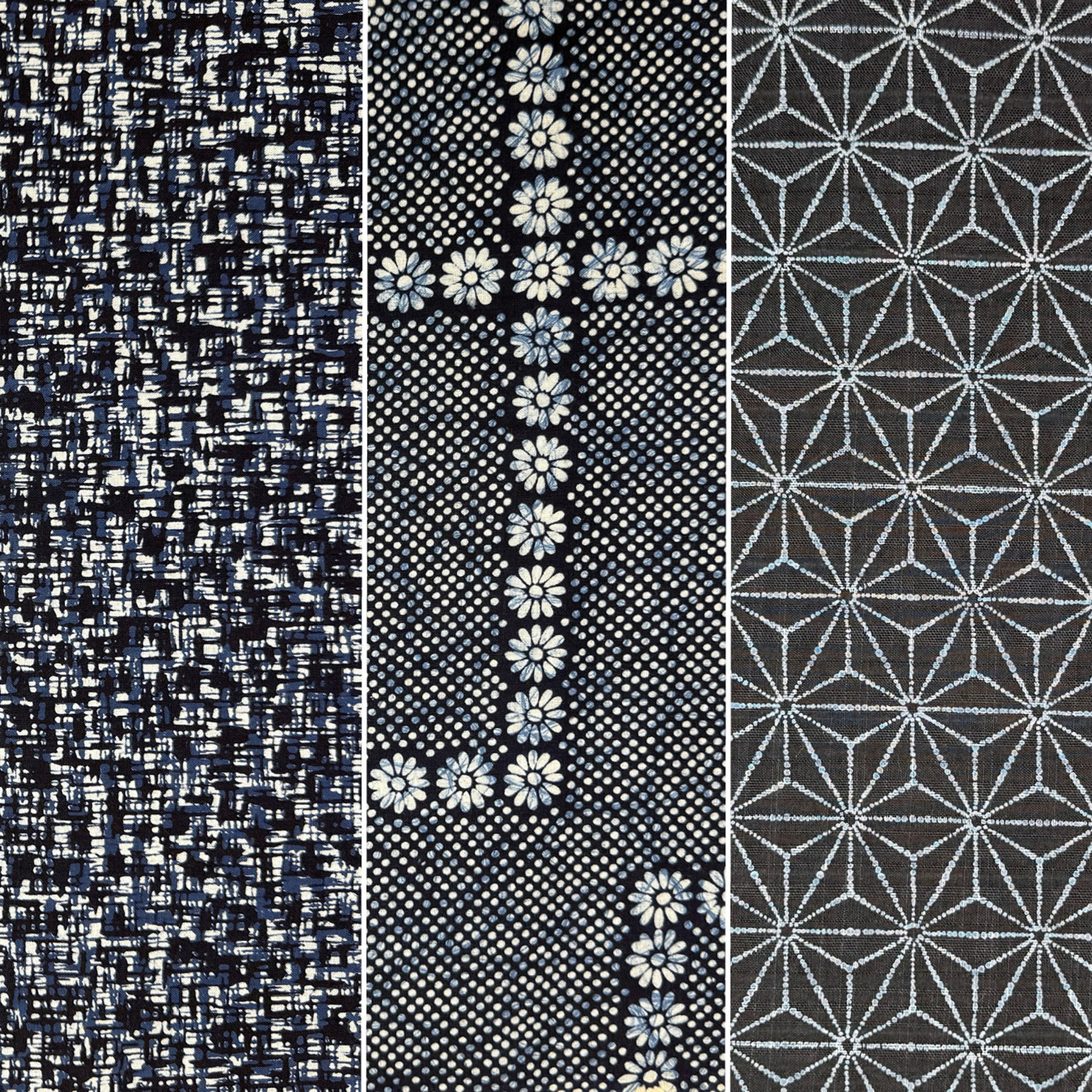 Pack includes three 1-yard pieces of indigo and white vintage Japanese yukata cotton—a light value, a mid value, and a dark value. The width of the yukata cottons, loomed for a summer kimono, are approximately 14".