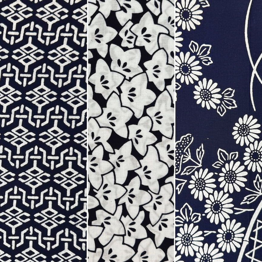 The Pack includes three 1-yard pieces of indigo and white vintage yukata cotton—a light value, a mid value, and a dark value. The width of the yukata cottons, loomed for a summer kimono, are approximately 14".