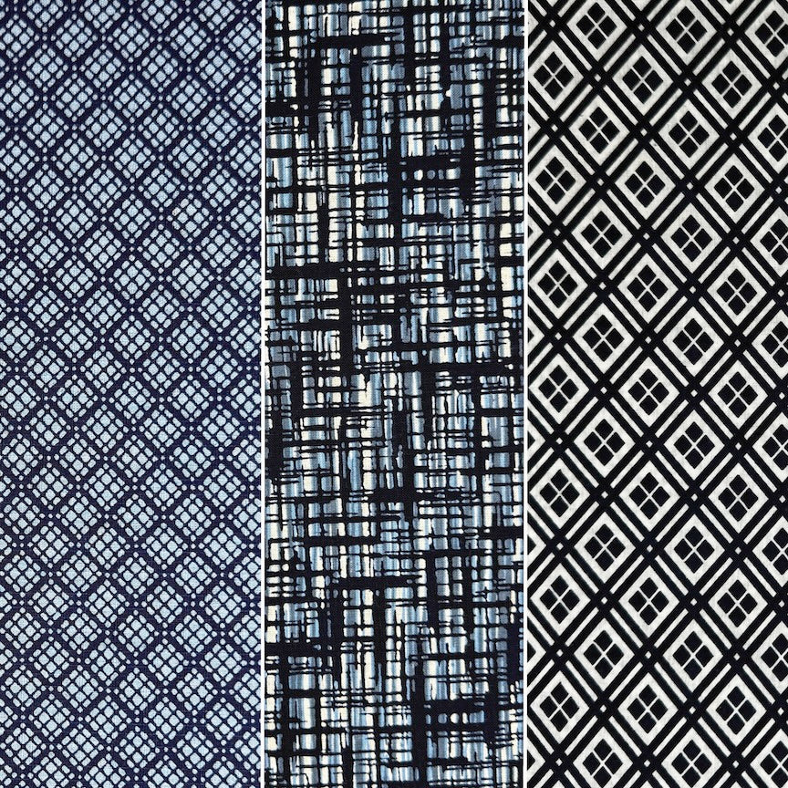 The Pack includes three 1-yard pieces of indigo and white vintage yukata cotton—a light value, a mid value, and a dark value. The width of the yukata cottons, loomed for a summer kimono, are approximately 14".