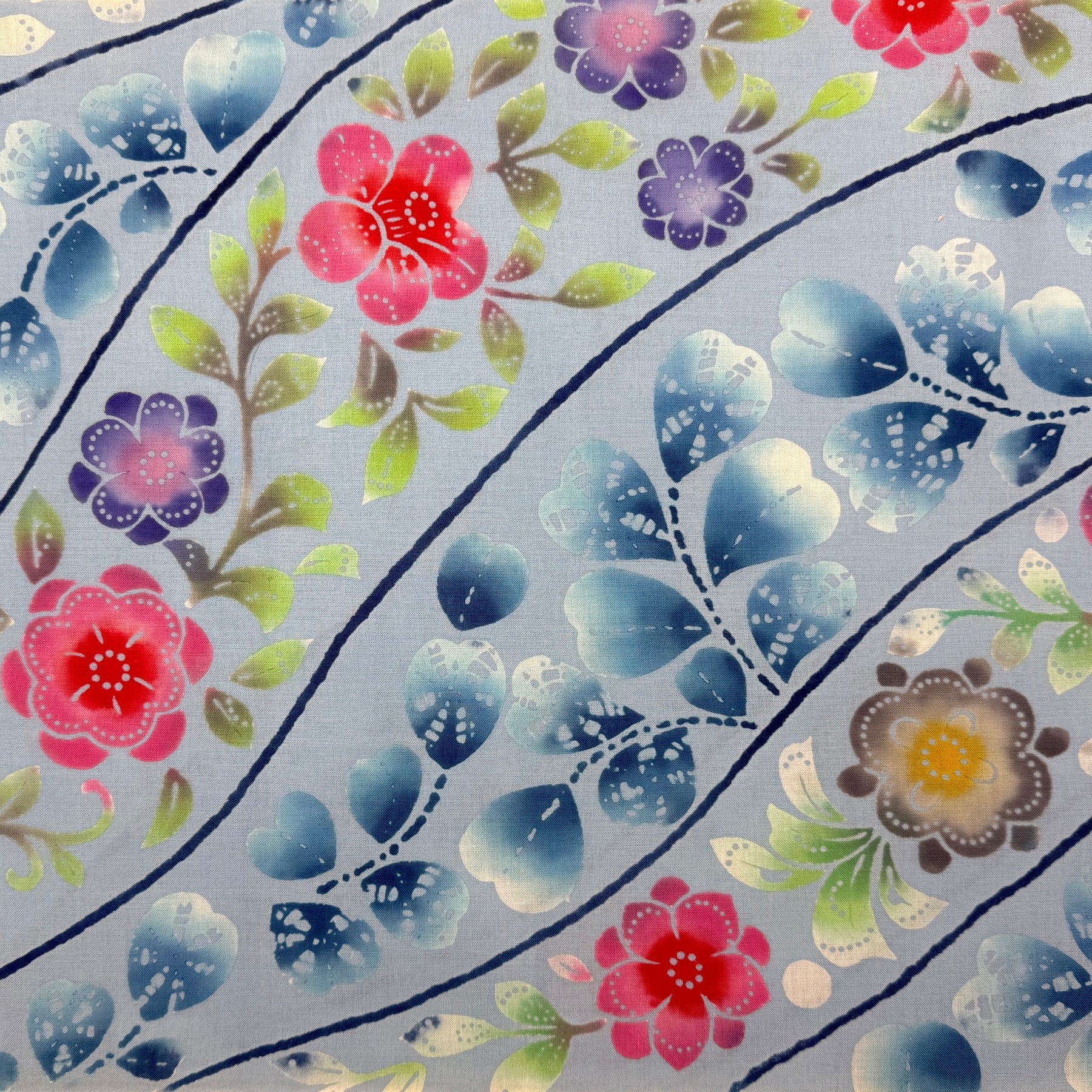 A bingata-style pattern of lacey flowers in red, purple, and gray flowing along with foliage of fresh green and white — plus navy dividing lines on a pretty light-blue background.