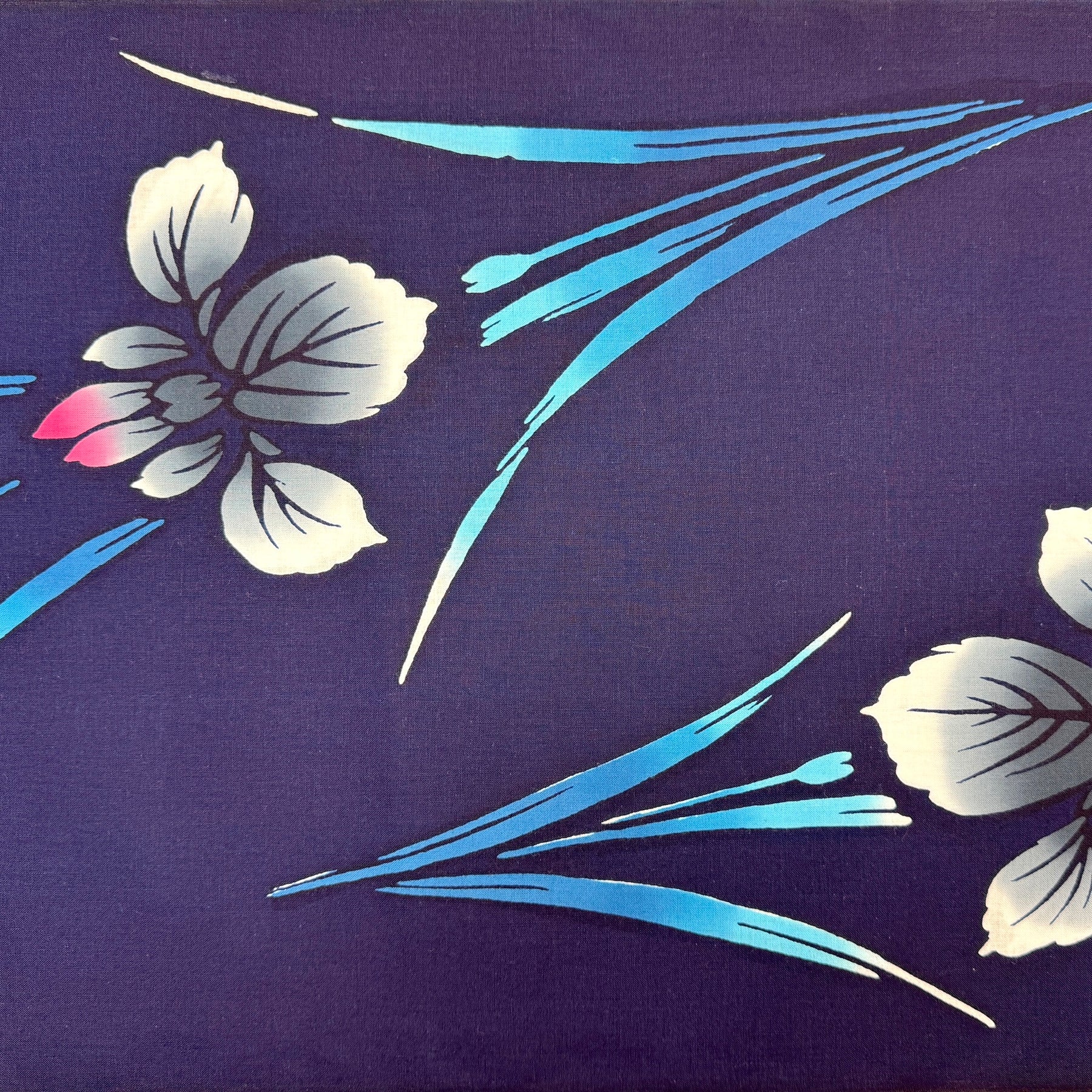 Charcoal-gray and white bunny-ear irises with pink tips and deep turquoise leaves on dark blue.