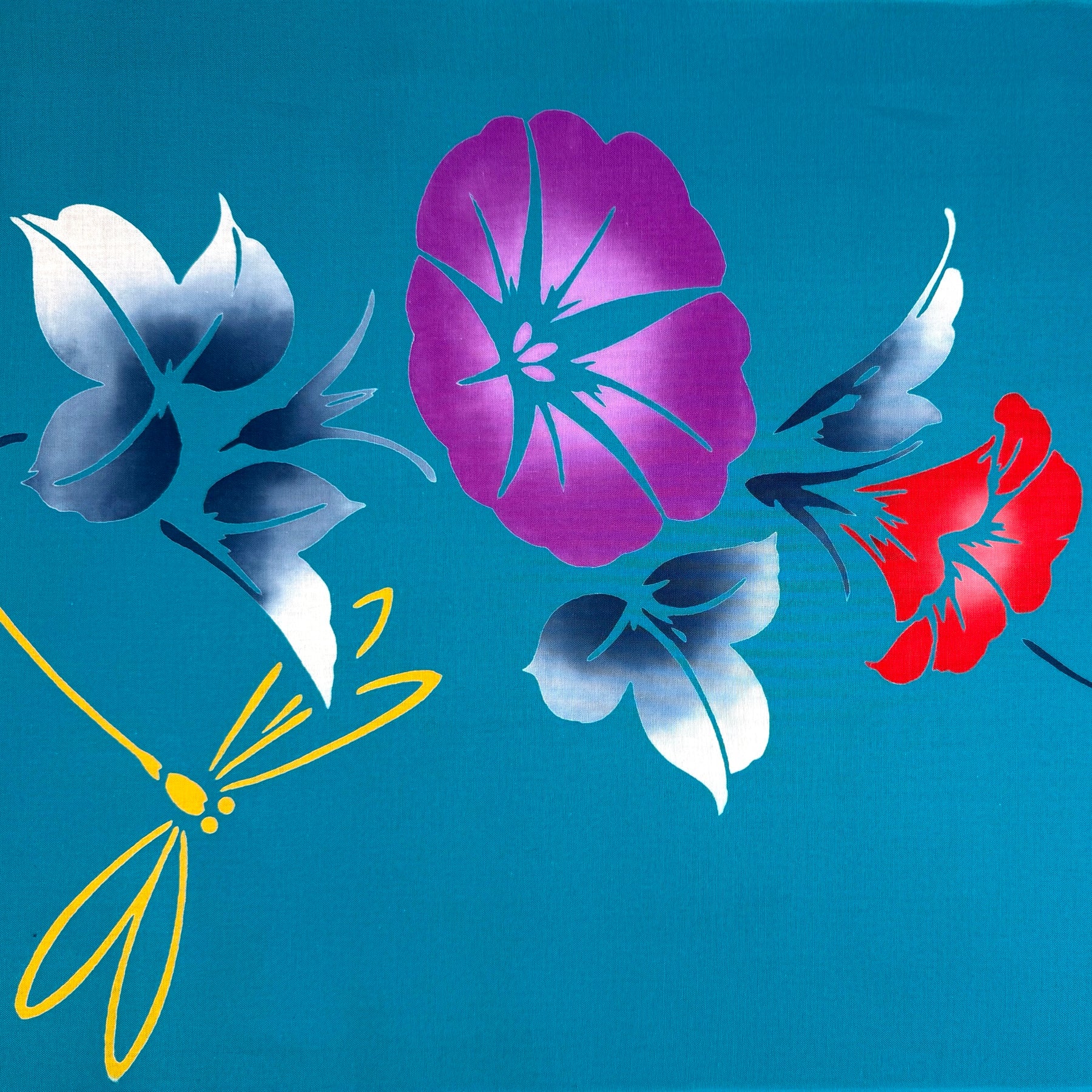 Plum and red morning glories with yellow dragonflies and indigo leaves on a teal yukata cotton.