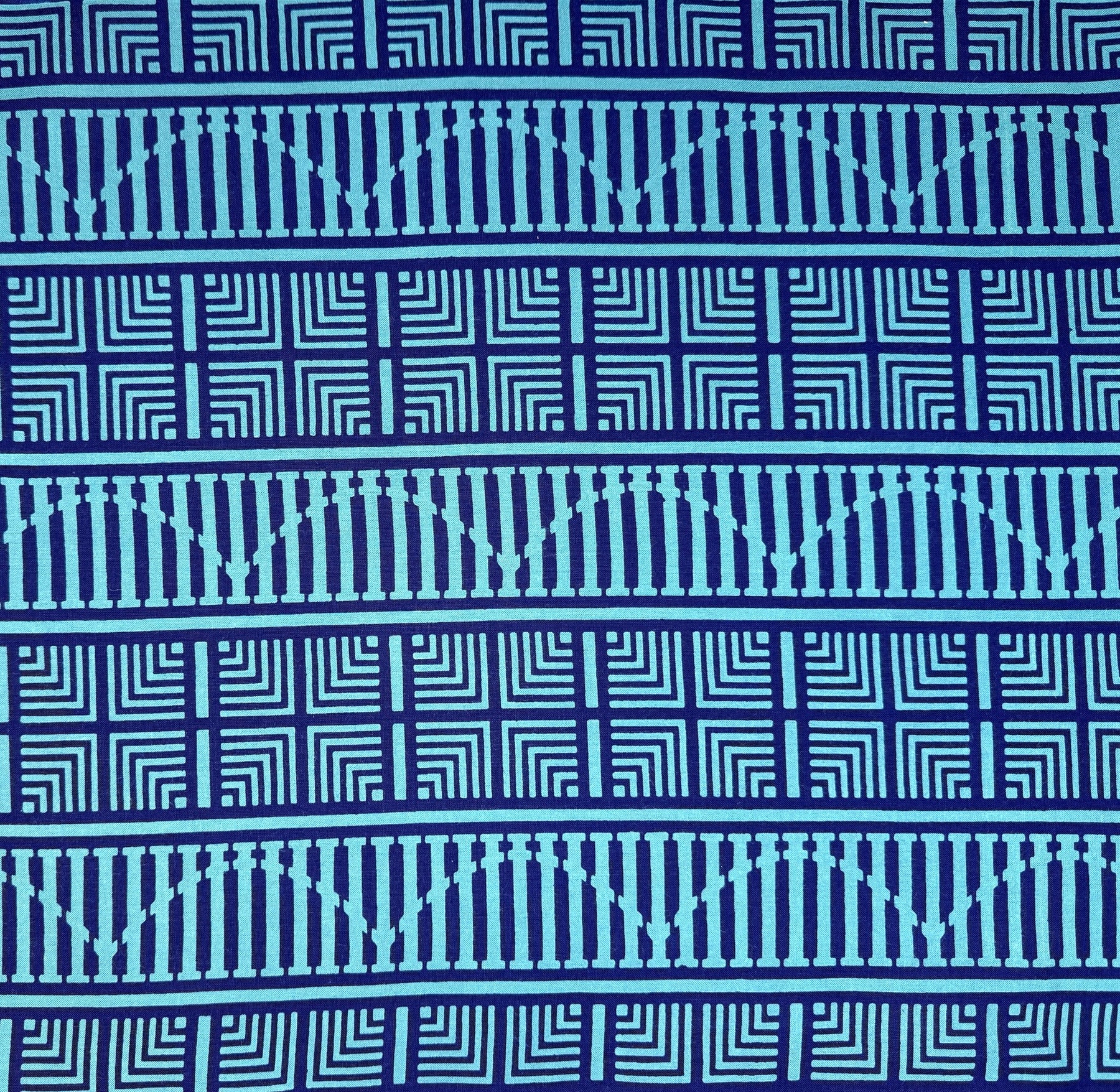 An exciting double-dyed geometric pattern with unusual indigo linework on top of lightly striated soft forest green.