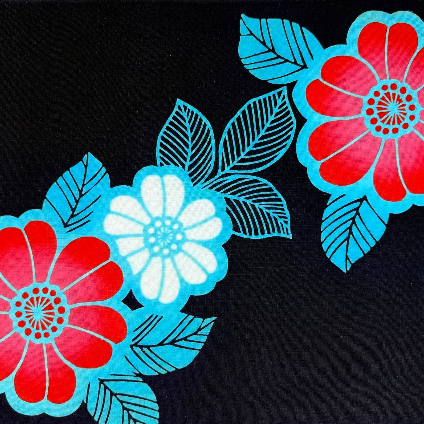 Red and white flowers — and leaves — are defined by turquoise linework on a background of darkest indigo.