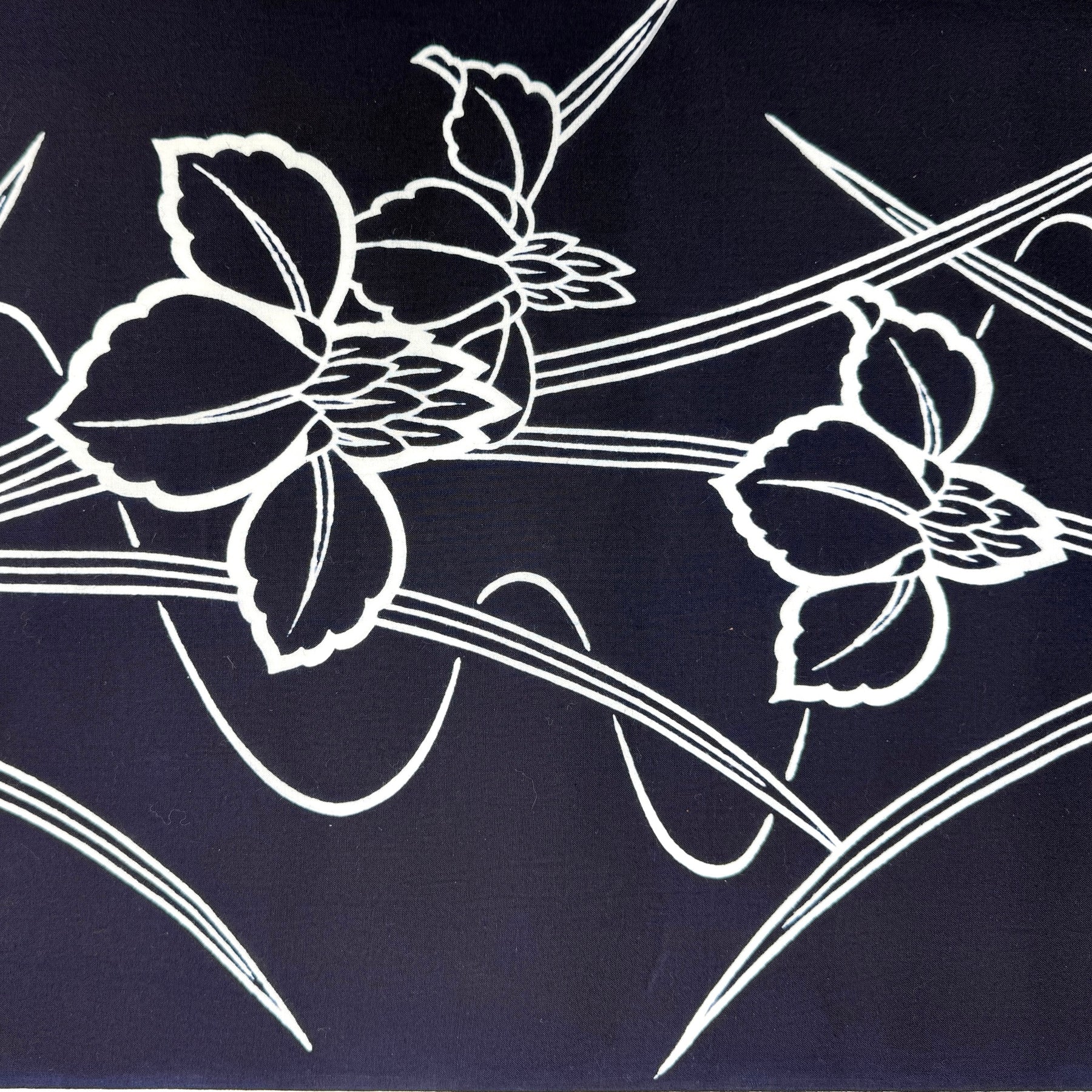 Oversized irises in white on deep indigo.