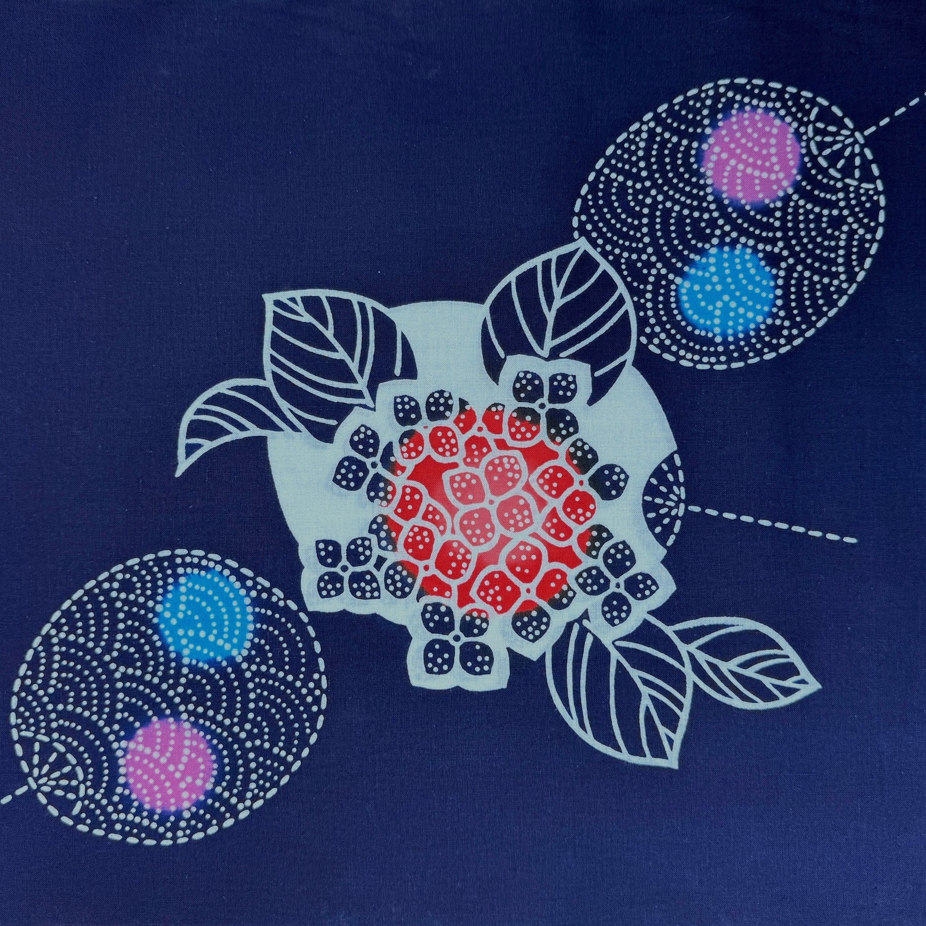 Fans! Hand fans with wave patterns and red and turquoise dots, plus hydrangeas in red and indigo on a dark indigo background.