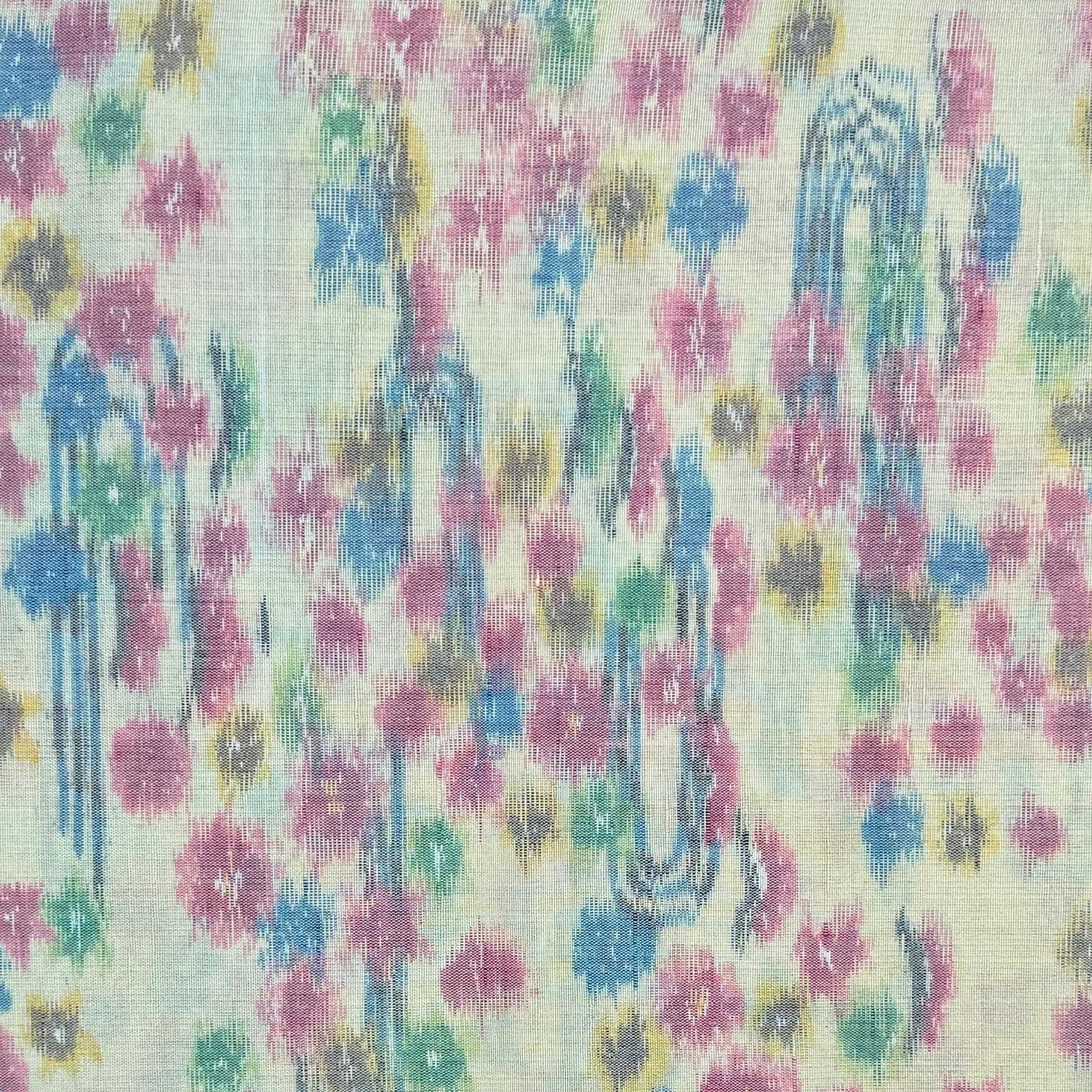 Ikat, a meticulous yarn-dyeing technique, creates patterns in the wool once woven. A characteristic of ikat, that’s prized by textile collectors, is the blurriness along the edges of the patterns due to the difficulty of lining up the dyed yarns.