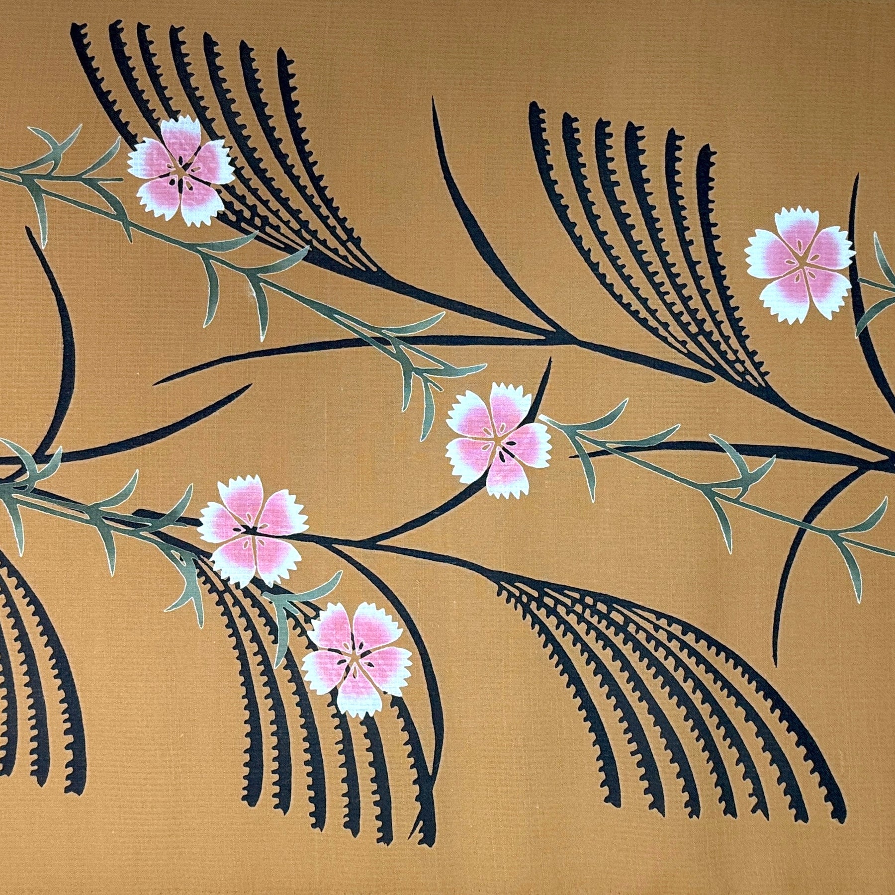 A rich ochre yukata cotton with pink and white dianthus, pine-green foliage, and black autumn grasses.